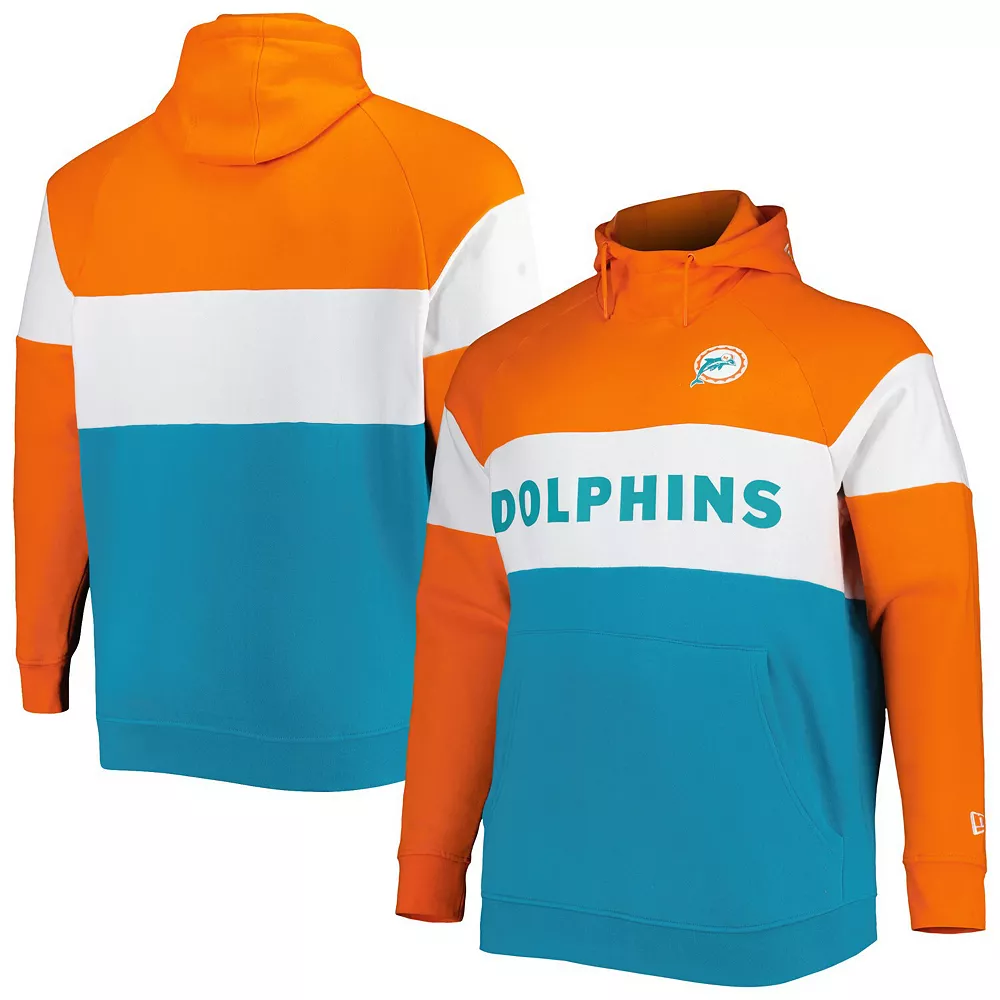 Upgrade your collection of official Miami Dolphins apparel with this Throwback pullover hoodie from New Era. It features a vibrant colorblock design that highlights the iconic team graphics that go across the front. The fleece lining and raglan sleeves work to keep you warm and protected while you cheer on your favorite Miami Dolphins players.